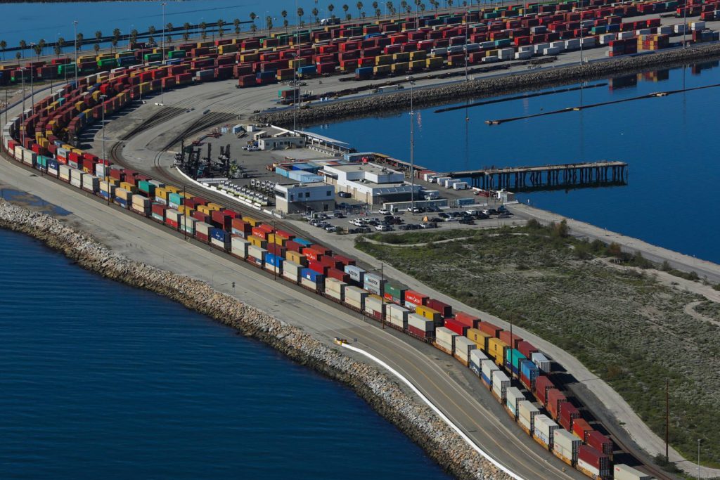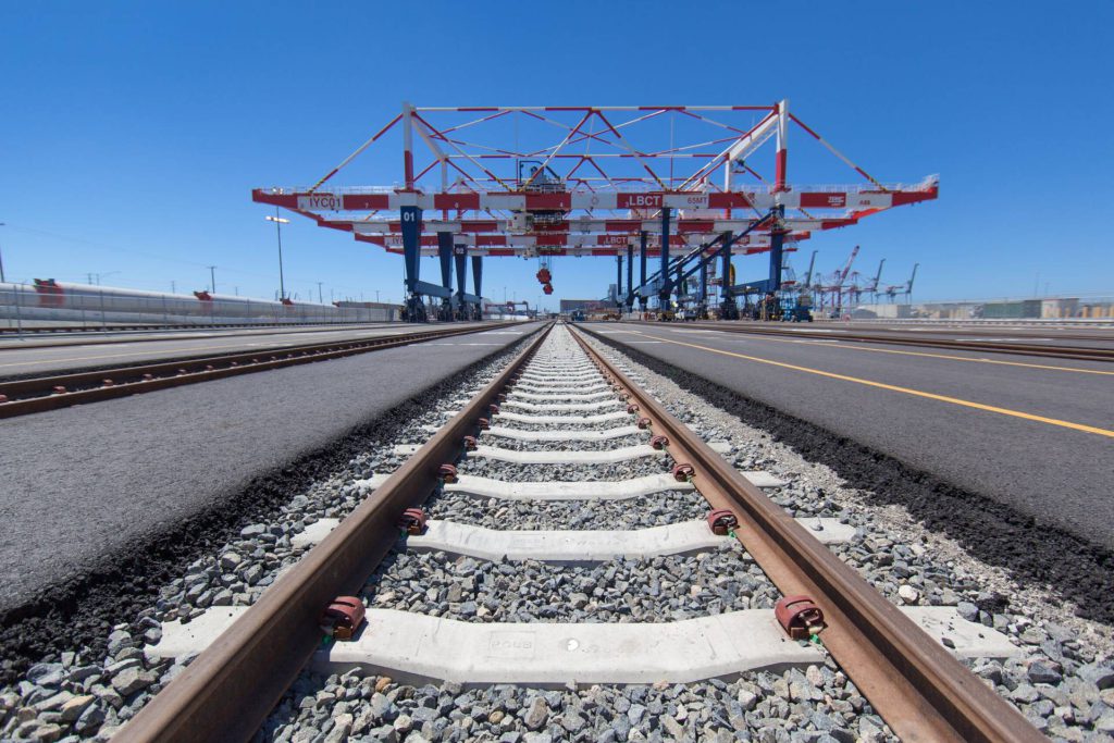 Workers will install new sewer and utility infrastructure at Pier E.On-dock rail at Pier E.On-dock rail saves energy on transport.The Port will be a staging area for massive wind turbines.Looking northwest from Pier J.Trades unions built the new POLB headquarters, opened in 2019.